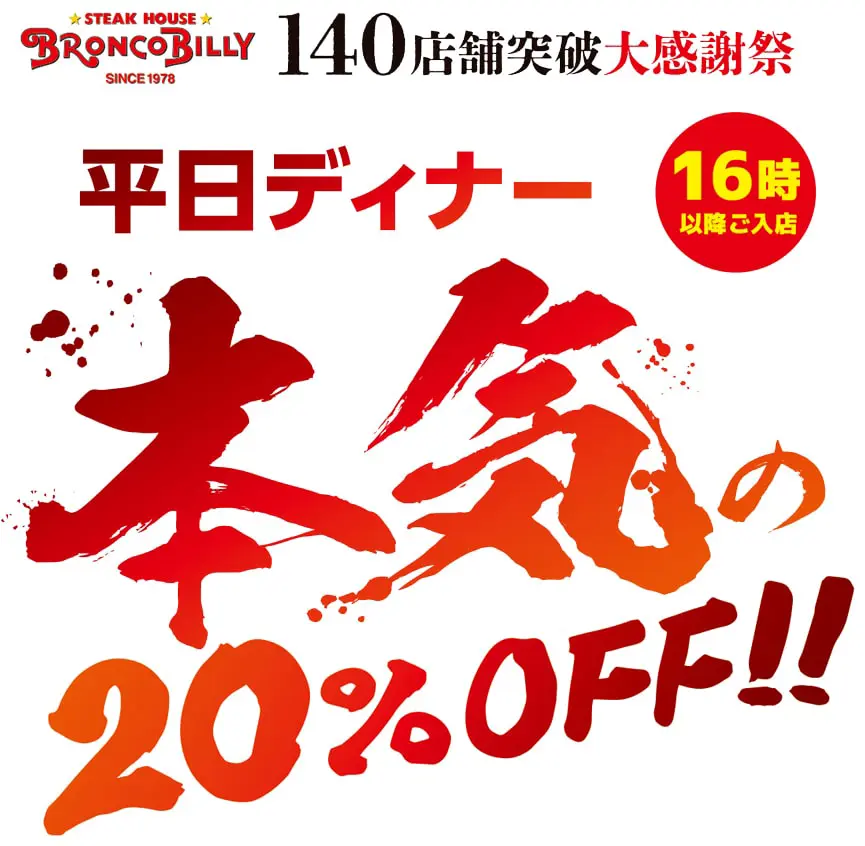 イベント期間中の平日ディナータイム(16時以降ご入店)のお食事代が全品20%OFF!